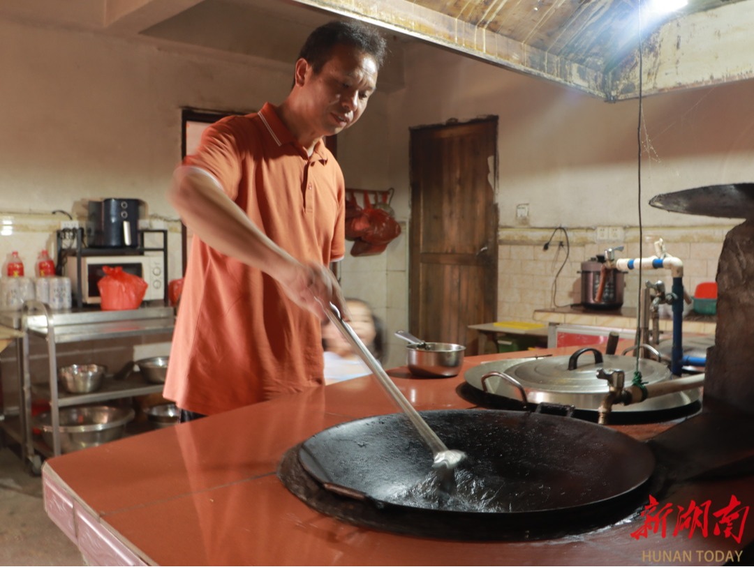 (雙牌縣茶林鎮(zhèn)桐子坳村銀杏生態(tài)農(nóng)家的老板蔣利群正在炒菜)