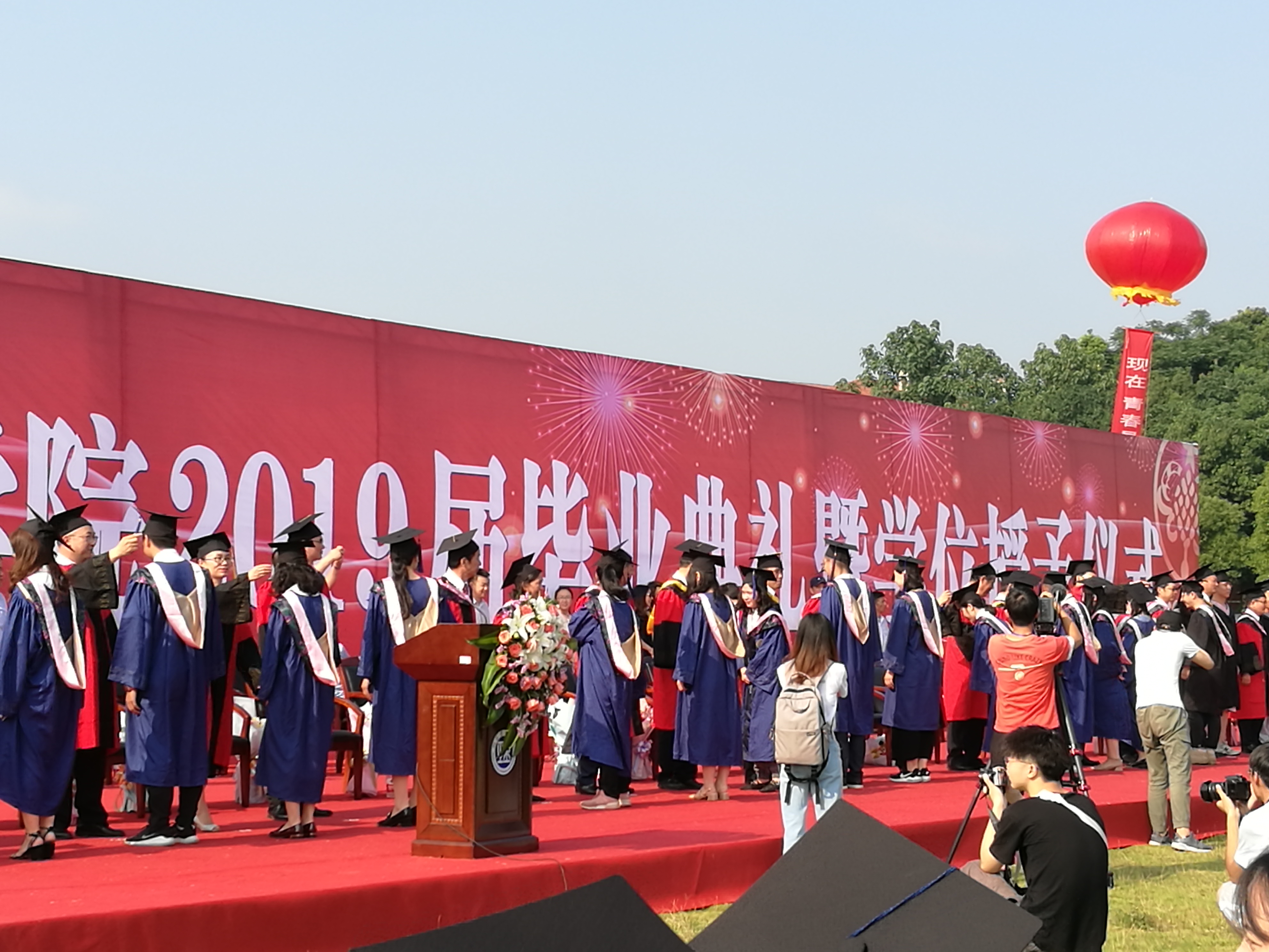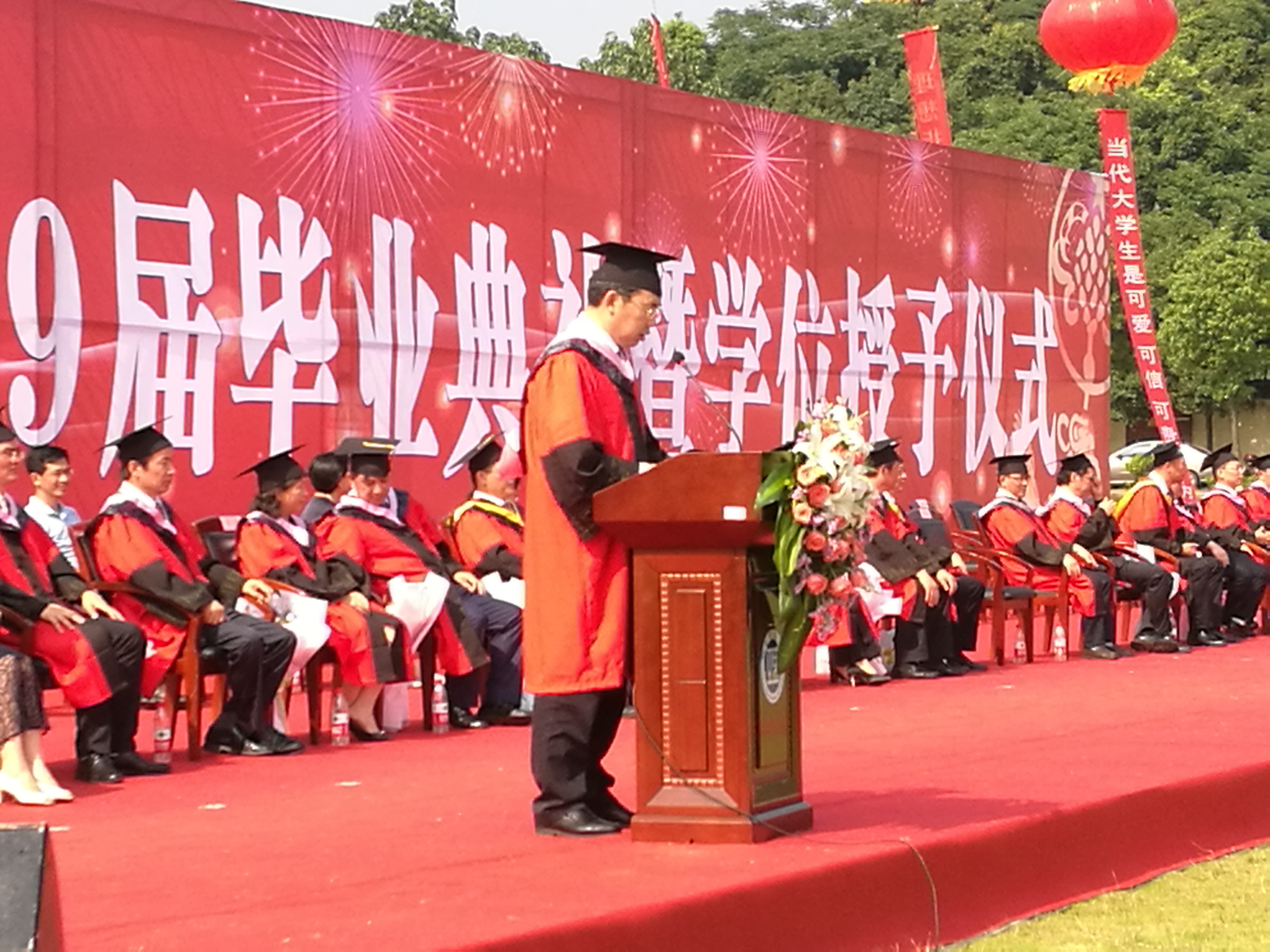 校園網(wǎng)訊6月14日上午,我校在陽光草坪舉行2019屆畢業(yè)典禮暨學(xué)位授予儀式,黨委書記李明、校長盧先明等校領(lǐng)導(dǎo)和導(dǎo)師代表在主席臺(tái)就坐,部分教師代表、留學(xué)生代表、學(xué)生家長代表以及2019屆本科畢業(yè)生、研究生畢業(yè)生參加了典禮。