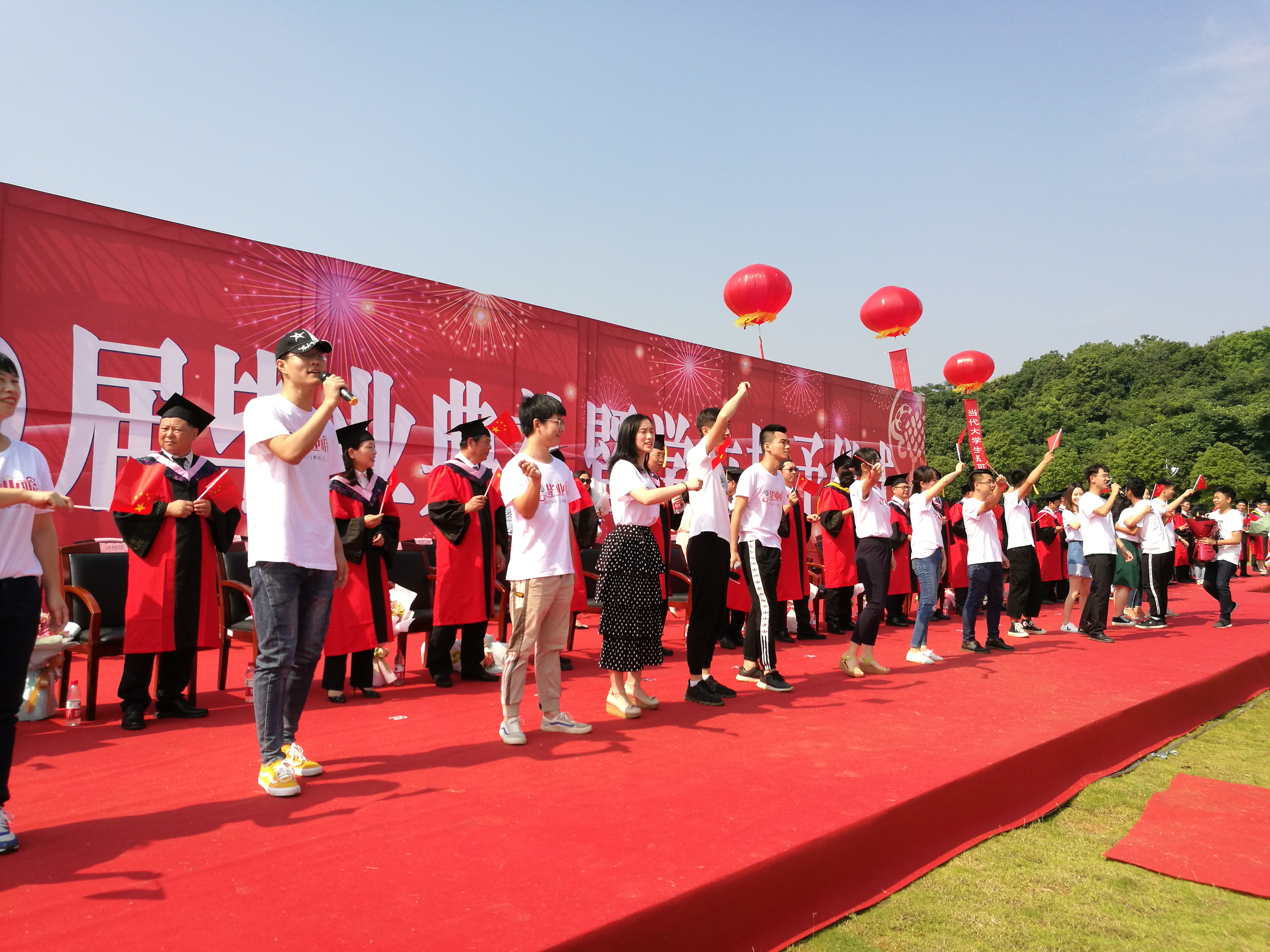 畢業(yè)年級(jí)輔導(dǎo)員及學(xué)生代表演唱《懷念青春》和《青春修煉手冊(cè)》。最后,典禮在全體畢業(yè)生合唱的《我和我的祖國》的歌聲中落幕,師生們移步理工食堂品嘗畢業(yè)生招待餐,感受學(xué)校的專屬味道。