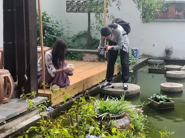 四合小院,黛瓦白墻,空氣中混合著草木清香,身處其中,仿佛消散了長沙夏日的悶熱。推開木門,沿著石板小路,我們來到正堂,民宿主人熱情地招待了我們,我們支起攝像機(jī),在艾草熏香的屋內(nèi)談起了關(guān)于這個(gè)民宿的故事。