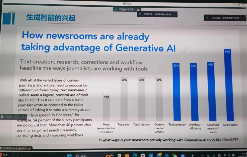 周葆華教授指出智能與算法無法割裂,人工智能的典型代表是算法,推薦算法由分發(fā)、匹配到生產(chǎn)就是算法到智能:生成智能的興起。生成智能不斷擴散,推薦算法正在重塑媒體與社會。他以機器人寫作、Chat GPT等人工智能為例,提出生成智能擁有其獨特的優(yōu)勢,能幫助人們減輕壓力,但是人工智能不能取代人類創(chuàng)造性活動。作為記者,在進行采寫與創(chuàng)作時,我們可以利用相關軟件與工具協(xié)助創(chuàng)作,可以有針對性地學習計算傳播的新知識。