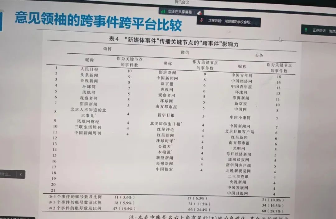 周葆華教授表示,計算與智能傳播研究主要有五個方面的價值。其一是做大規(guī)模的多案例的比較,注重對于基礎理論和傳播學規(guī)律的分析,并以自身研究“意見領袖的跨事件跨平臺比較”為例,指出多案例分析有助于社會規(guī)律的發(fā)現(xiàn)。