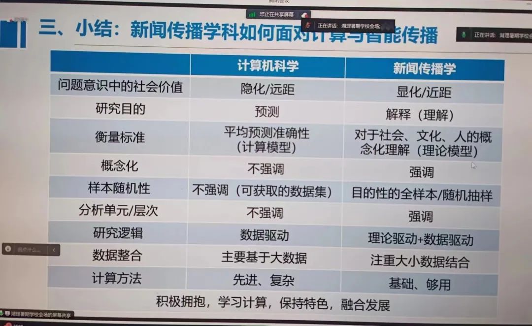 周葆華教授通過比較計算機科學與新聞傳播學的問題與社會價值、研究目的、衡量標準、概念化、樣本隨機性、分析單元/層次、研究邏輯、數(shù)據(jù)整合、計算方法等,建議同學們積極擁抱新事物,學習基本計算能力,保持我們的專業(yè)特色以及優(yōu)勢并且融合發(fā)展。
