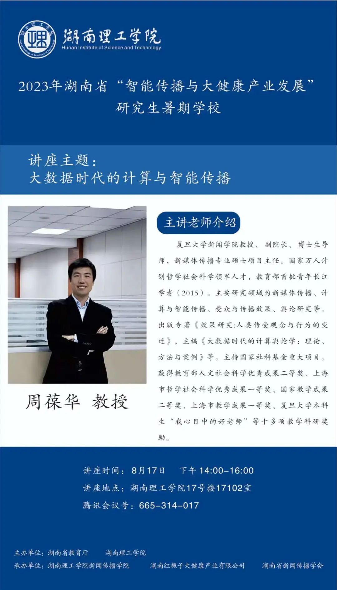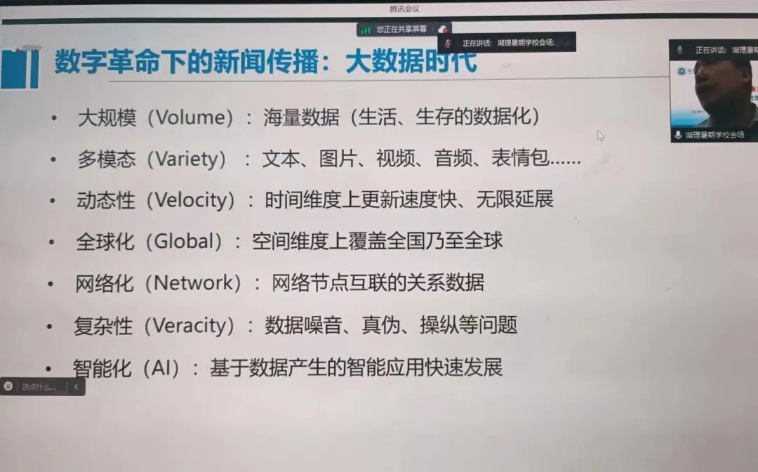 【編者按】8月16日至30日,由湖南省教育廳、湖南理工學院主辦,湖南理工學院新聞傳播學院、湖南紅梔子大健康產(chǎn)業(yè)有限公司、湖南省新聞傳播學會承辦的2023年湖南省“智能傳播與大健康產(chǎn)業(yè)發(fā)展”研究生暑期學校邀請國內新聞傳播學科知名專家學者、健康傳播產(chǎn)業(yè)領域業(yè)界專家授課。來自湖南理工學院、中國傳媒大學等全國各大高校的119名博士研究生、碩士研究生、本科生入學,開展專題研學。8月17日下午,復旦大學新聞學院教授、副院長、博士生導師、新媒體傳播專業(yè)碩士項目主任周葆華作了題為“大數(shù)據(jù)時代的計算與智能傳播”的講座。本場講座主持人為湖南理工學院新聞傳播學院副院長肖濤教授。本文根據(jù)講座內容整理。