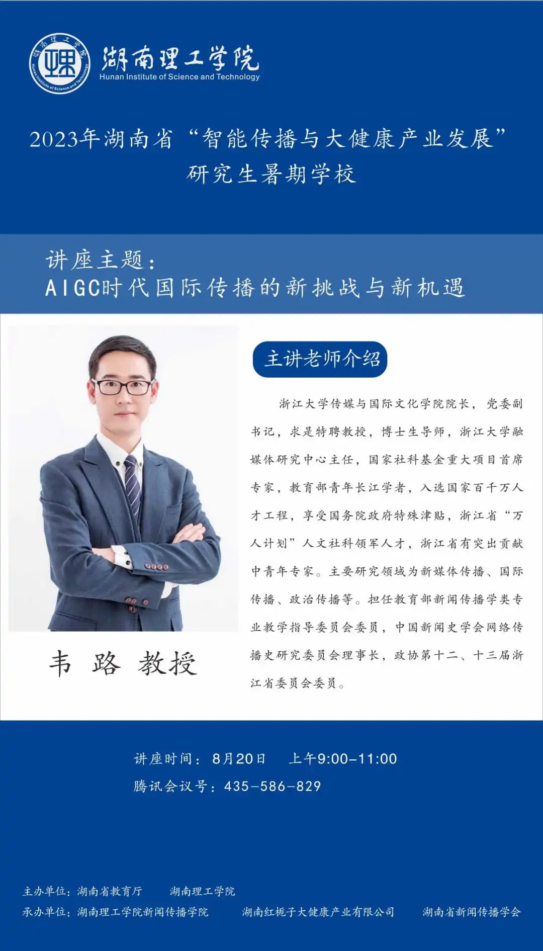 【編者按】8月16日至30日,由湖南省教育廳、湖南理工學(xué)院主辦,湖南理工學(xué)院新聞傳播學(xué)院、湖南紅梔子大健康產(chǎn)業(yè)有限公司、湖南省新聞傳播學(xué)會承辦的2023年湖南省“智能傳播與大健康產(chǎn)業(yè)發(fā)展”研究生暑期學(xué)校邀請國內(nèi)新聞傳播學(xué)科知名專家學(xué)者、健康傳播產(chǎn)業(yè)領(lǐng)域業(yè)界專家授課。來自湖南理工學(xué)院、中國傳媒大學(xué)等全國各大高校的119名博士研究生、碩士研究生、本科生入學(xué),開展專題研學(xué)。8月20日上午,浙江大學(xué)傳媒與國際文化學(xué)院院長、黨委副書記、求是特聘教授、博士生導(dǎo)師、浙江大學(xué)融媒體研究中心主任、國家社科基金重大項目首席專家、教育部青年長江學(xué)者韋路作了題為“AIGC時代國際傳播的新挑戰(zhàn)和新機(jī)遇”的講座。本場講座主持人為湖南理工學(xué)院新聞傳播學(xué)院碩士生導(dǎo)師劉晶博士。本文根據(jù)講座內(nèi)容整理。