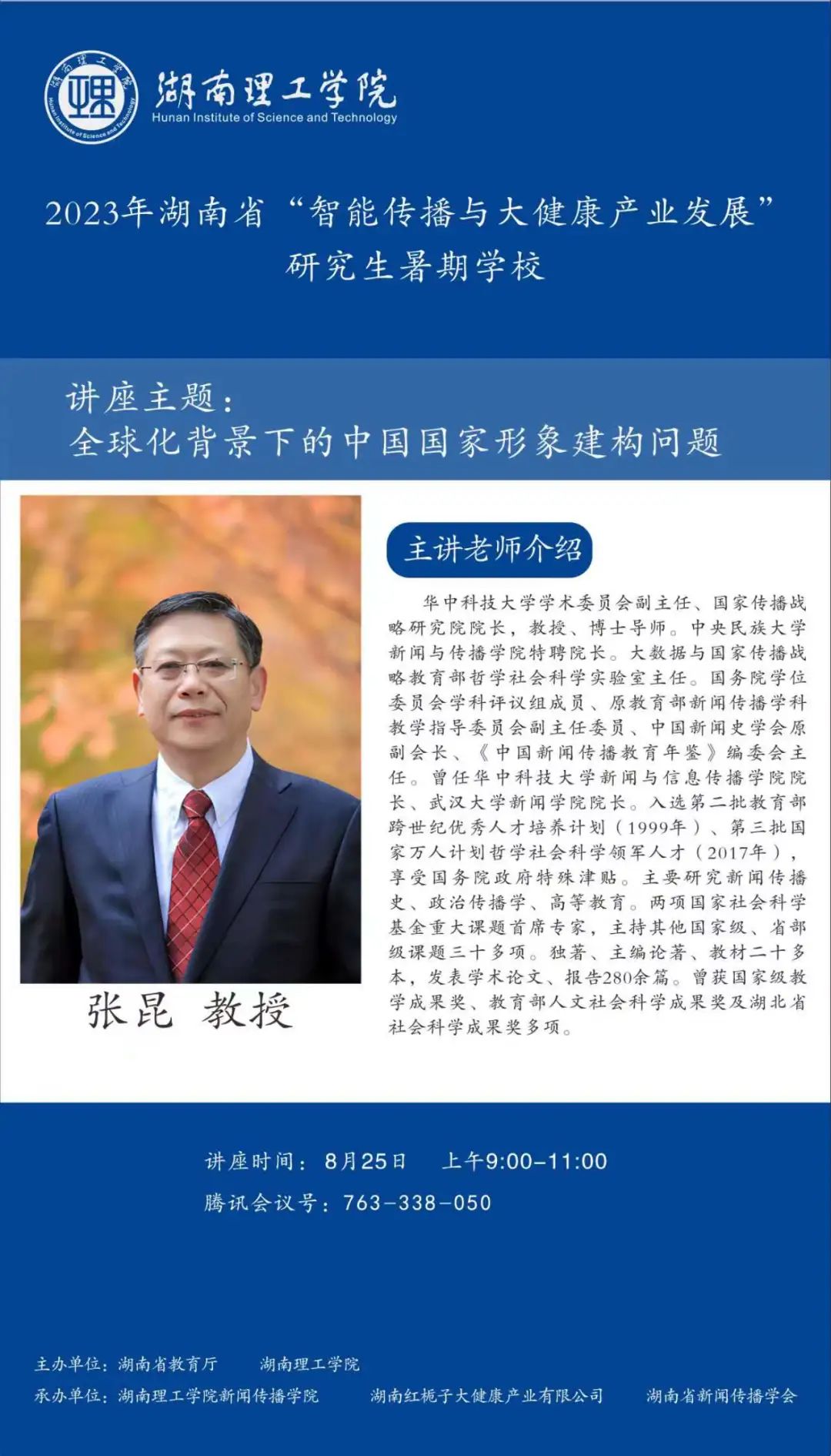 【編者按】8月16日至30日,由湖南省教育廳、湖南理工學(xué)院主辦,湖南理工學(xué)院新聞傳播學(xué)院、湖南紅梔子大健康產(chǎn)業(yè)有限公司、湖南省新聞傳播學(xué)會承辦的2023年湖南省“智能傳播與大健康產(chǎn)業(yè)發(fā)展”研究生暑期學(xué)校邀請國內(nèi)新聞傳播學(xué)科知名專家學(xué)者、健康傳播產(chǎn)業(yè)領(lǐng)域業(yè)界專家授課。來自湖南理工學(xué)院、中國傳媒大學(xué)等全國各大高校的119名博士研究生、碩士研究生、本科生入學(xué),開展專題研學(xué)。8月25日上午,華中科技大學(xué)新聞與信息傳播學(xué)院院長、華中科技大學(xué)學(xué)術(shù)委員會副主任、大數(shù)據(jù)國家傳播戰(zhàn)略教育部哲學(xué)社會科學(xué)實驗室主任、國家傳播戰(zhàn)略研究院院長張昆作了題為“全球化背景下的國家形象建構(gòu)問題”的講座。本場講座主持人為湖南理工學(xué)院新聞傳播學(xué)院院長王文鋒教授。本文根據(jù)講座內(nèi)容整理。