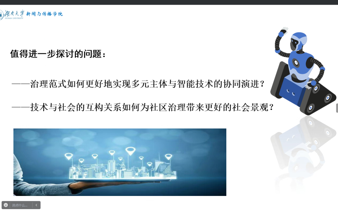 最后,彭祝斌教授對智能傳播時代的社區(qū)精細化治理提出了三點啟示和思考:一是從”役于物”到“假于物”,讓工具理性回歸實踐理性;二是技術(shù)應(yīng)用回歸“受眾本位”,降低多元主體間的協(xié)作成本;三是充分重視“人”與“社會”的互構(gòu)關(guān)系,維護治理過程中個體的基本權(quán)益。