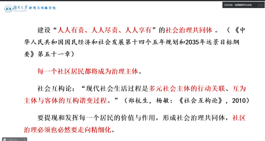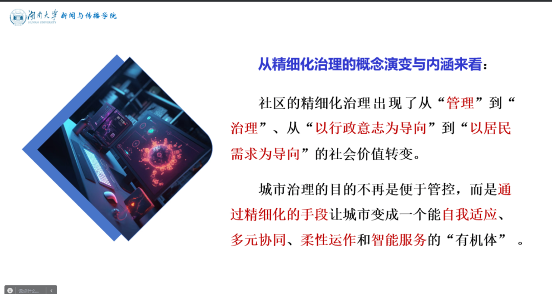 “技術(shù)革命與智能傳播經(jīng)過了怎樣的發(fā)展?”“社區(qū)精細化治理的概念如何理解?”“社區(qū)精細化治理的理論基礎(chǔ)是什么?”……彭祝斌教授圍繞這些問題作了深入闡述。