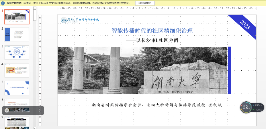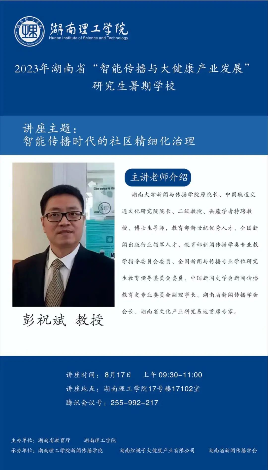 【編者按】8月16日至30日,由湖南省教育廳、湖南理工學(xué)院主辦,湖南理工學(xué)院新聞傳播學(xué)院、湖南紅梔子大健康產(chǎn)業(yè)有限公司、湖南省新聞傳播學(xué)會承辦的2023年湖南省“智能傳播與大健康產(chǎn)業(yè)發(fā)展”研究生暑期學(xué)校邀請國內(nèi)新聞傳播學(xué)科知名專家學(xué)者、健康傳播產(chǎn)業(yè)領(lǐng)域業(yè)界專家授課。來自湖南理工學(xué)院、中國傳媒大學(xué)等全國各大高校的119名博士研究生、碩士研究生、本科生入學(xué),開展專題研學(xué)。8月17日上午,湖南大學(xué)新聞與傳播學(xué)院原院長、二級教授、岳麓學(xué)者特聘教授、博士生導(dǎo)、湖南省新聞傳播學(xué)會會長彭祝斌作了題為“智能傳播時代的社區(qū)精細化治理”的講座。本場講座主持人為湖南理工學(xué)院新聞傳播學(xué)院院長王文鋒教授。本文根據(jù)講座內(nèi)容整理。