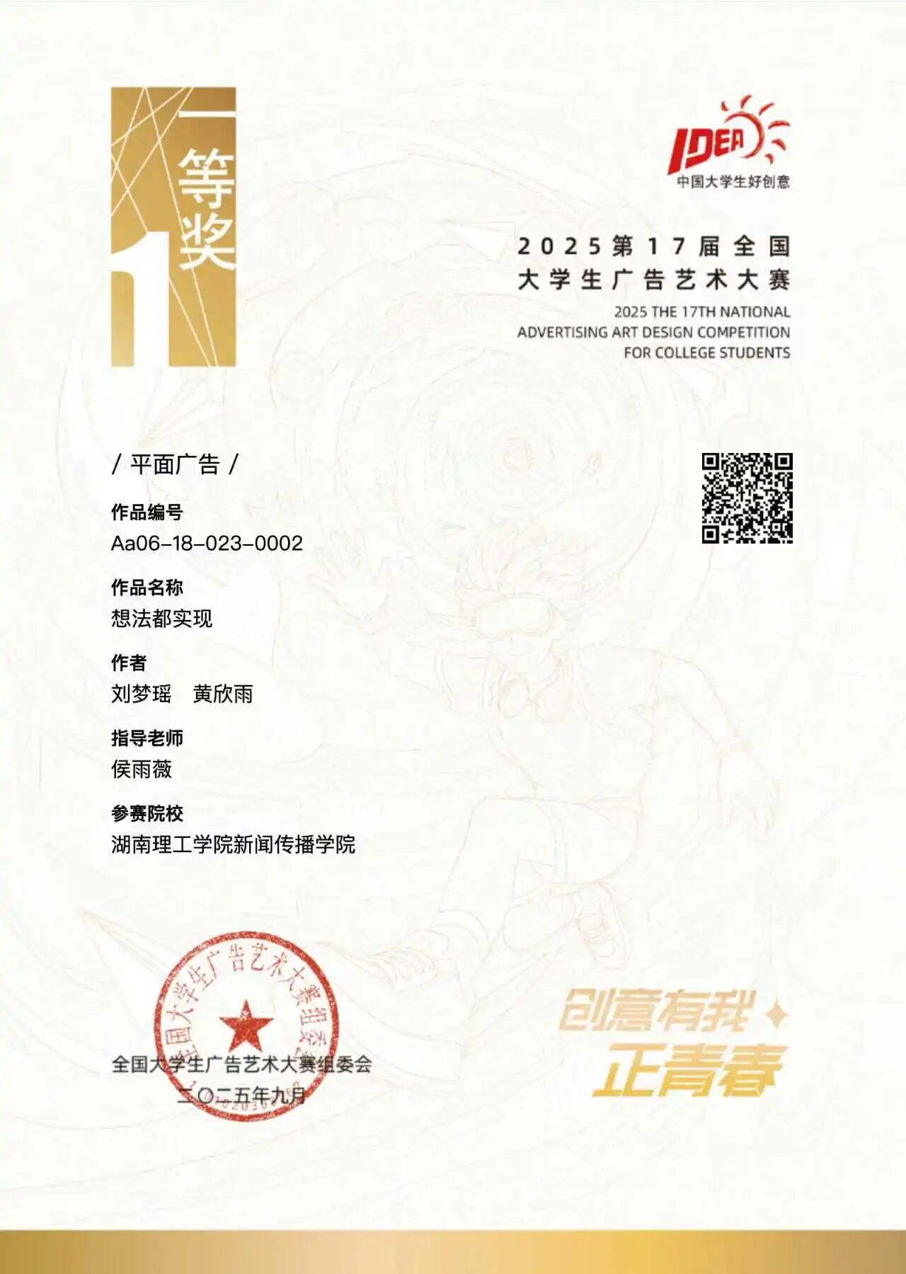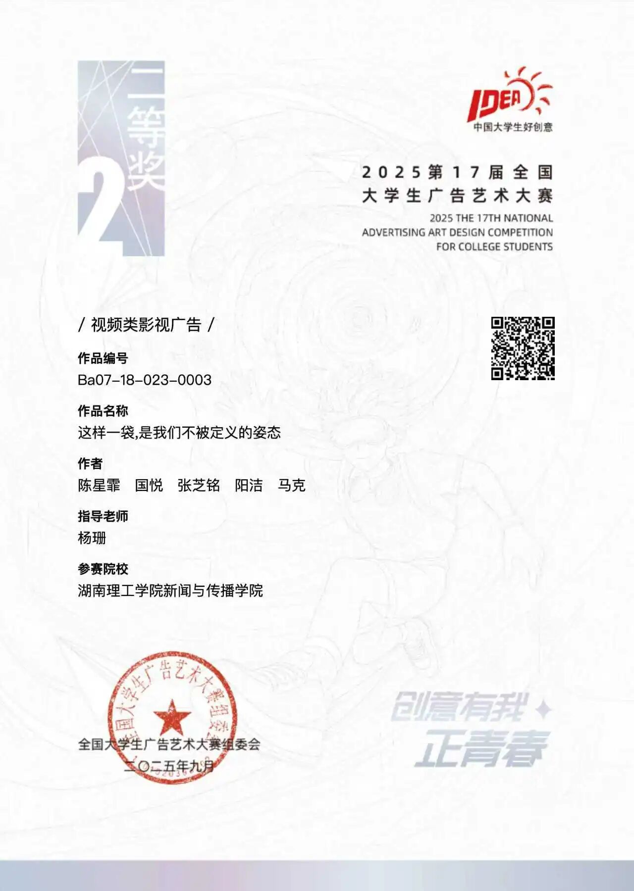 學(xué)生劉夢(mèng)瑤、黃欣雨的作品《想法都實(shí)現(xiàn)》獲平面廣告類(lèi)一等獎(jiǎng);陳星霏、國(guó)悅、張芝銘、陽(yáng)潔、馬克的作品《這樣一袋,是我們不被定義的姿態(tài)》獲視頻類(lèi)影視廣告二等獎(jiǎng);鄧建婷、王月、李聰?shù)淖髌贰段⒁曨l》獲營(yíng)銷(xiāo)創(chuàng)客微視頻類(lèi)三等獎(jiǎng)。