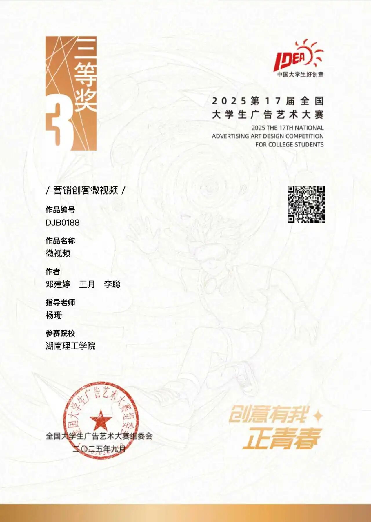 9月6日,第十七屆大學(xué)生廣告藝術(shù)大賽國(guó)賽結(jié)果揭曉。文學(xué)與新聞傳播學(xué)院共有3件作品獲獎(jiǎng),其中一等獎(jiǎng)、二等獎(jiǎng)、三等獎(jiǎng)各1項(xiàng)。