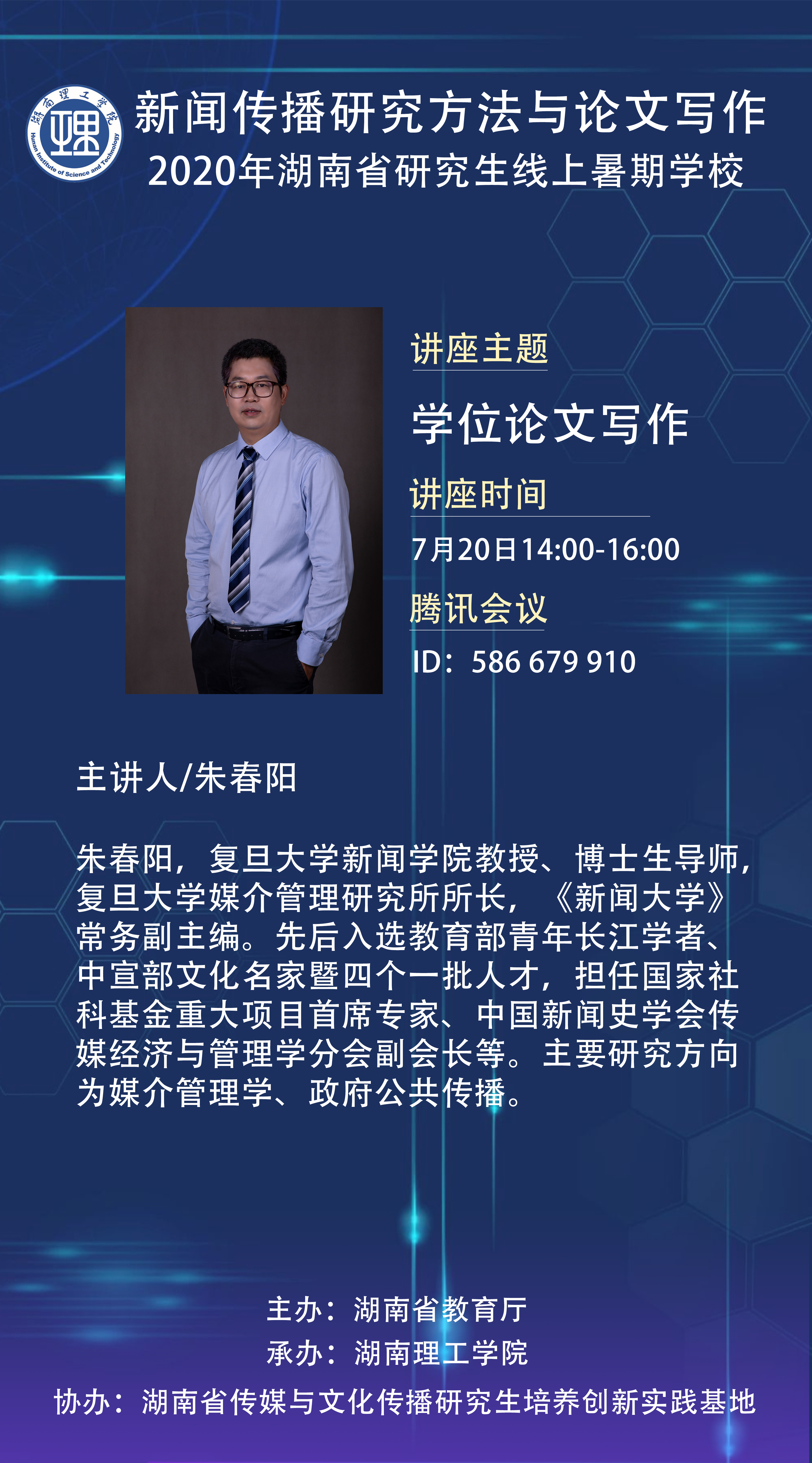 7月20日下午,復(fù)旦大學(xué)媒介管理研究所所長(zhǎng)、博士生導(dǎo)師、《新聞大學(xué)》常務(wù)副主編朱春陽(yáng)教授應(yīng)邀為2020年湖南省研究生線上暑期學(xué)校進(jìn)行了“學(xué)位論文寫作的經(jīng)驗(yàn)交流”的主題講座,本次講座吸引了來自全國(guó)各地的300多名師生,講座由湖南理工學(xué)院新聞傳播學(xué)院院長(zhǎng)王文鋒教授主持。