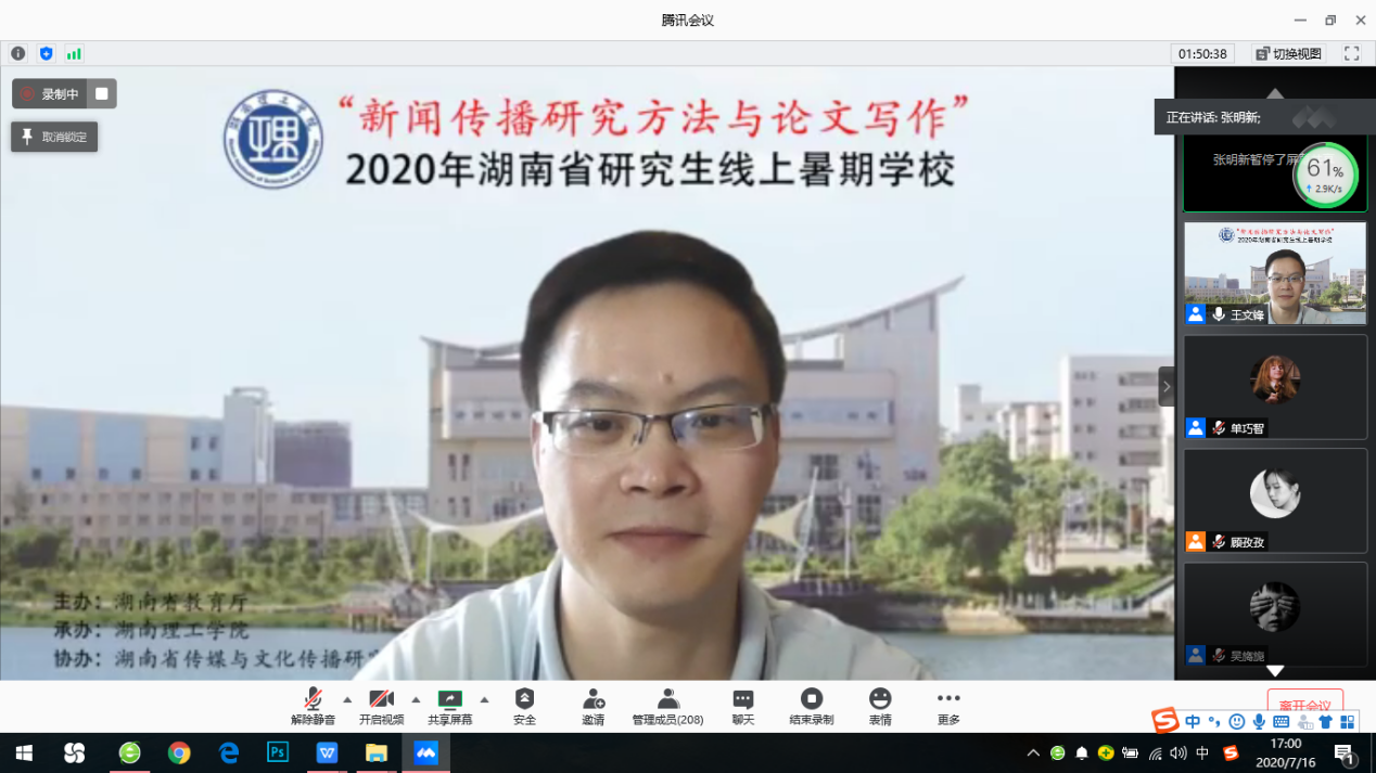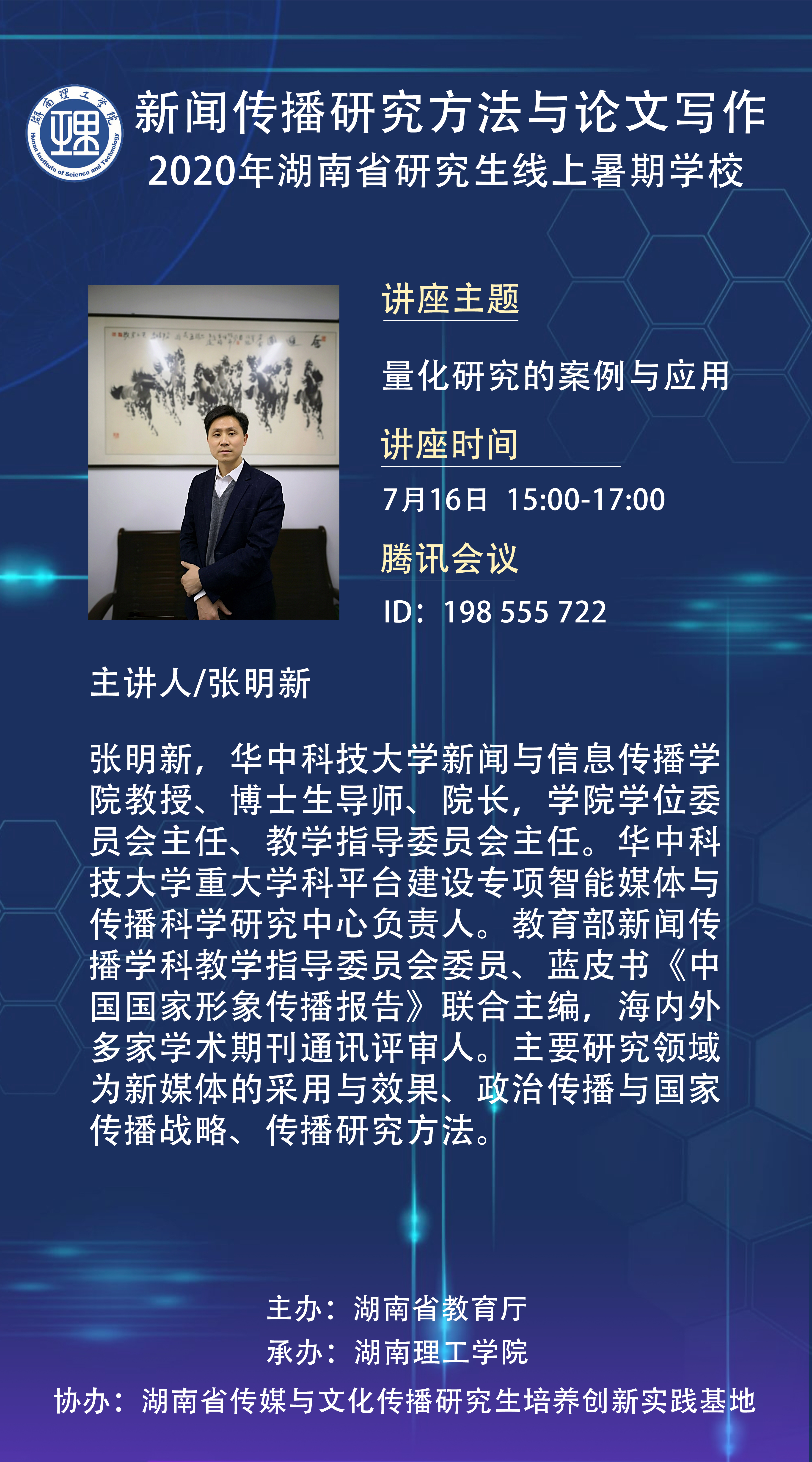 7月16日下午,華中科技大學(xué)新聞與信息傳播學(xué)院院長、博士生導(dǎo)師、教育部新聞傳播學(xué)科教學(xué)指導(dǎo)委員會委員張明新教授應(yīng)邀為2020年湖南省研究生線上暑期學(xué)校進行了“量化研究的案例與應(yīng)用”的主題講座,本次講座吸引了來自全國各地的300多名師生,講座由湖南理工學(xué)院新聞傳播學(xué)院院長王文鋒教授主持。