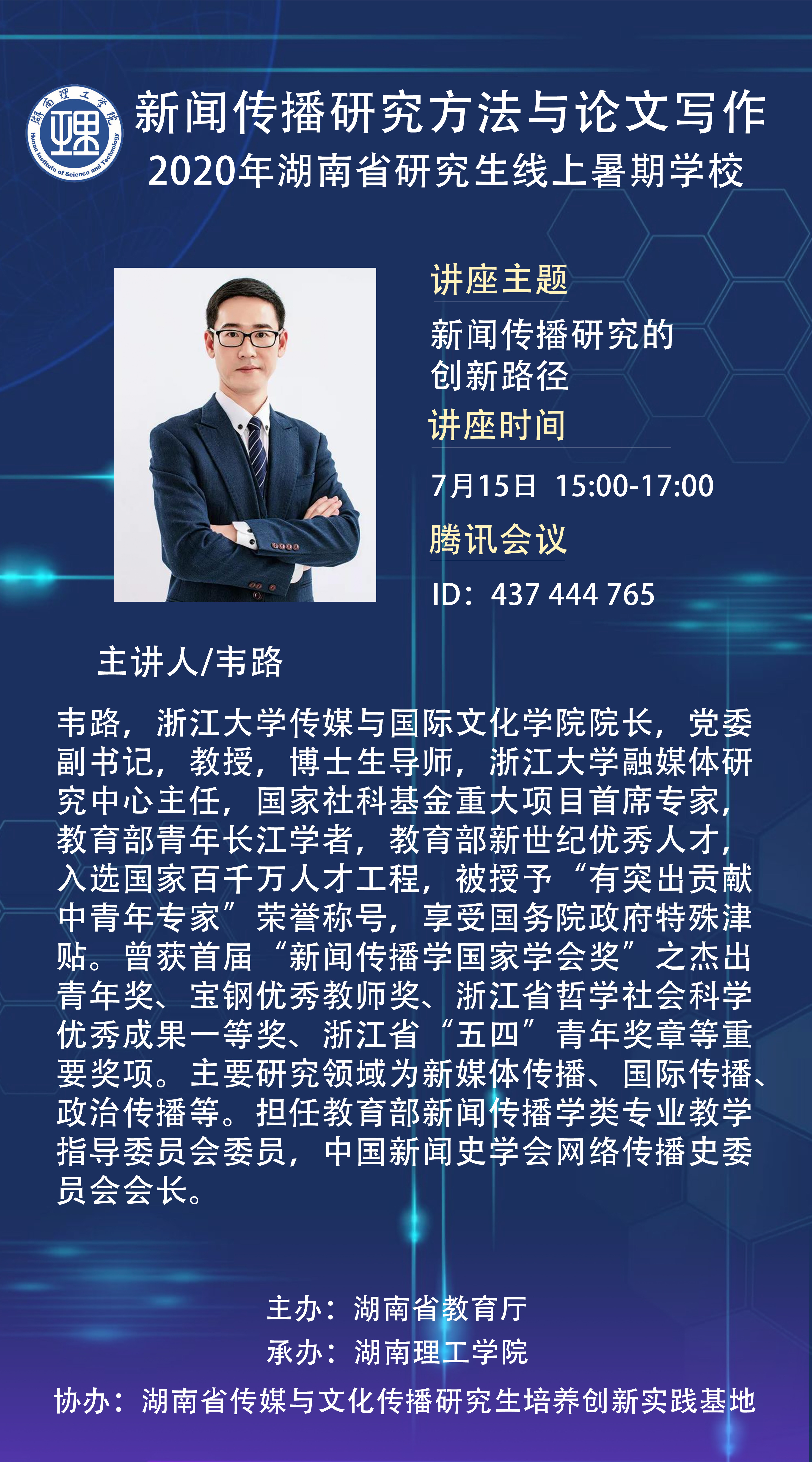 7月15日下午3點(diǎn),浙江大學(xué)傳媒與國(guó)際文化學(xué)院院長(zhǎng)、教授、博導(dǎo)、教育部青年長(zhǎng)江學(xué)者韋路教授應(yīng)邀為2020年湖南省研究生線上暑期學(xué)校進(jìn)行了“新聞傳播研究的創(chuàng)新路徑”的主題講座,本次講座吸引了來(lái)自全國(guó)各地的300多名師生,講座由湖南理工學(xué)院新聞傳播學(xué)院副院長(zhǎng)羅洪程教授主持。