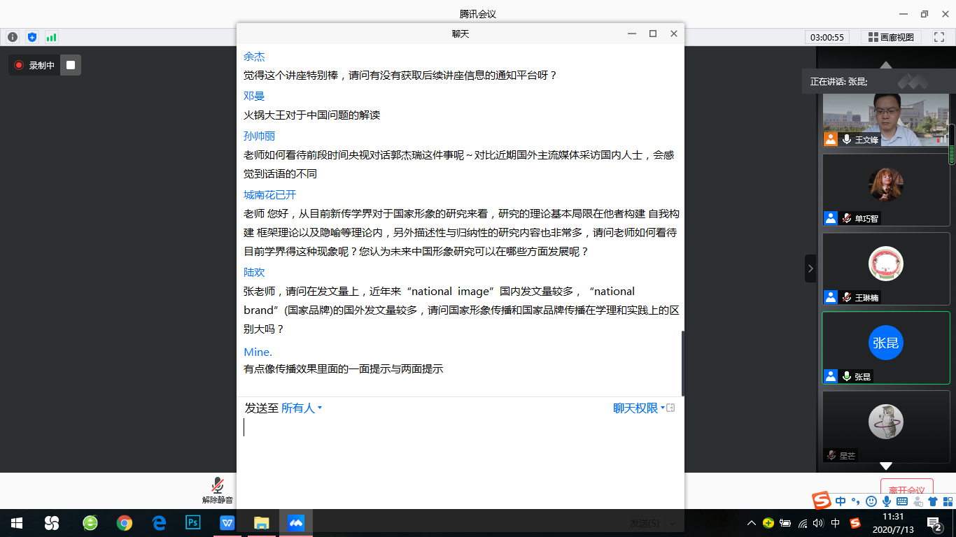 講座進(jìn)入互動(dòng)環(huán)節(jié),線上學(xué)員踴躍提問(wèn),就國(guó)家形象的構(gòu)建相關(guān)問(wèn)題提出疑問(wèn),張昆為學(xué)員們答疑解惑。針對(duì)正面宣傳的誤區(qū)以及負(fù)面信息傳播的尺度的矛盾問(wèn)題,他提出“關(guān)于國(guó)家形象問(wèn)題,如果提到外國(guó)人對(duì)中國(guó)印象存在不好的地方是很正常的,問(wèn)題是我們要通過(guò)自己的努力,改變別人的印象,所以目前我們努力的空間還是比較大的。”