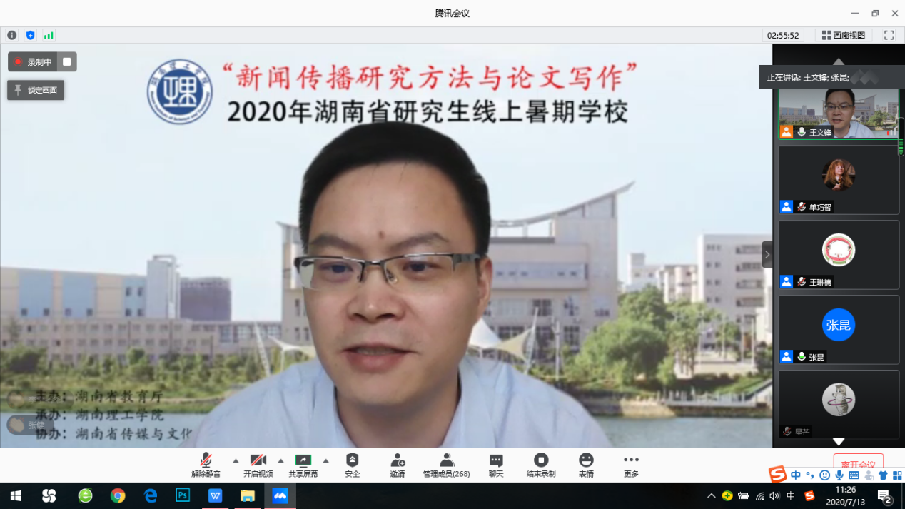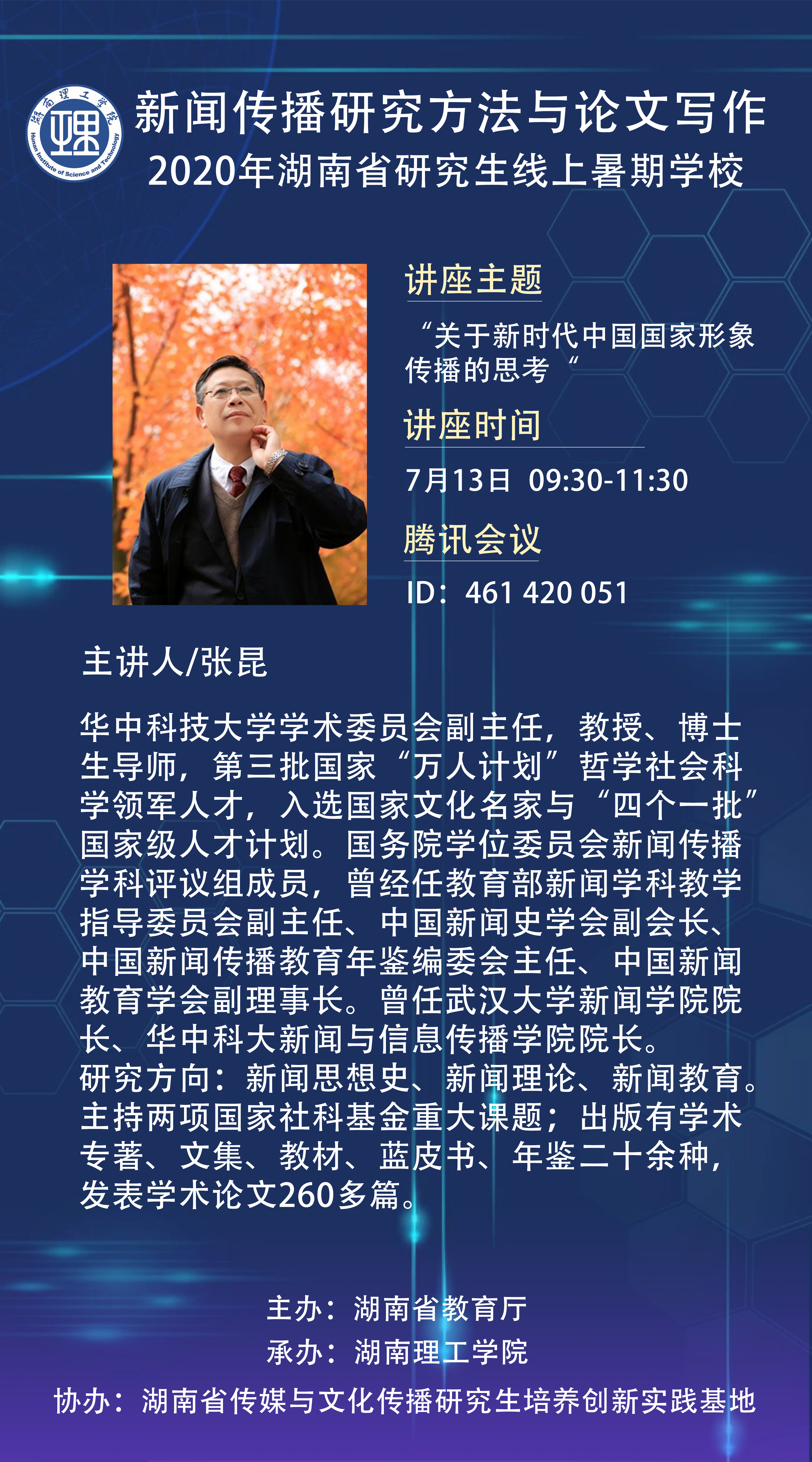 7月13日上午,2020年湖南省研究生線上暑期學(xué)校第一期學(xué)術(shù)講座拉開(kāi)帷幕。中國(guó)新聞傳播研究和教育領(lǐng)域杰出學(xué)者、華中科技大學(xué)學(xué)術(shù)委員會(huì)副主任、教授、博士生導(dǎo)師張昆作為主講嘉賓,發(fā)表了名為“關(guān)于新時(shí)代中國(guó)國(guó)家形象傳播的思考”主題講座。湖南理工學(xué)院新聞傳播學(xué)院領(lǐng)導(dǎo)班子成員及暑假學(xué)校學(xué)員參與本期講座。