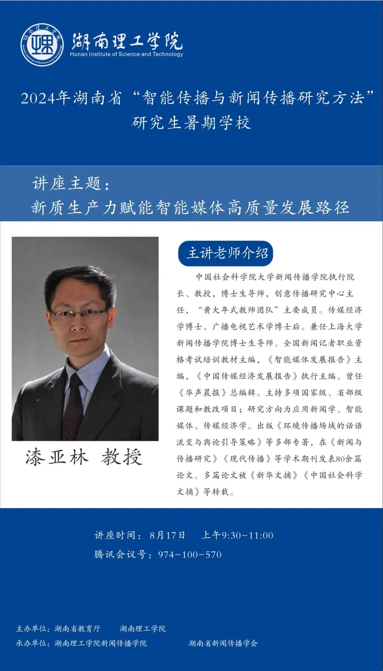 【編者按】8月16日至30日,由湖南省教育廳、湖南理工學院主辦,湖南理工學院新聞傳播學院、湖南省新聞傳播學會承辦的2024年湖南省“智能傳播與新聞傳播研究方法”研究生暑期學校邀請國內新聞傳播學科知名專家學者授課。來自中國社會科學院大學、中國傳媒大學、湖南理工學院等全國各大高校的159名博士研究生、碩士研究生、本科生入學,開展專題研學。8月17日上午,中國社會科學院大學新聞傳播學院執(zhí)行院長、博士生導師、創(chuàng)意傳播中心主任漆亞林教授作了題為“新質生產(chǎn)力賦能智能媒體高質量發(fā)展路徑”的講座。本場講座主持人為湖南理工學院新聞傳播學院羅洪程教授,本文根據(jù)講座內容整理。