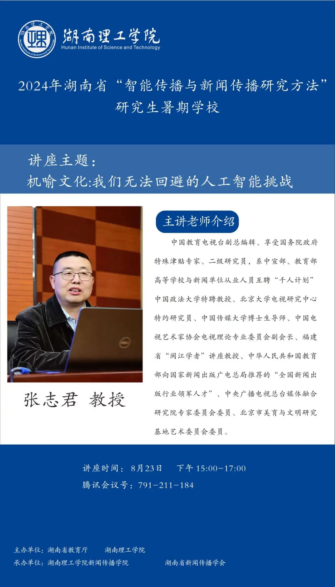 【編者按】8月16日至30日,由湖南省教育廳、湖南理工學(xué)院主辦,湖南理工學(xué)院新聞傳播學(xué)院、湖南省新聞傳播學(xué)會(huì)承辦的2024年湖南省“智能傳播與新聞傳播研究方法”研究生暑期學(xué)校邀請國內(nèi)新聞傳播學(xué)科知名專家學(xué)者授課。來自中國社會(huì)科學(xué)院大學(xué)、中國傳媒大學(xué)、湖南理工學(xué)院等全國各大高校的159名博士研究生、碩士研究生、本科生入學(xué),開展專題研學(xué)。8月23日,中國教育電視臺副總編輯、中國傳媒大學(xué)博士生導(dǎo)師、中國電視藝術(shù)家協(xié)會(huì)電視理論專業(yè)委員會(huì)副會(huì)長張志君作了題為“機(jī)喻文化:硅基生命主體對于影視教育的影響及應(yīng)對策略”的講座。本場講座主持人為湖南理工學(xué)院新聞傳播學(xué)院副院長柳溪教授。本文根據(jù)講座內(nèi)容整理。