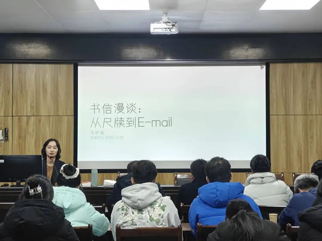 12月25日晚,文學(xué)與新聞傳播學(xué)院在9401會議室舉辦南湖講壇第四十期第十五講“書信漫談:從尺牘到Email”專題講座。本次講座由李夢溪博士主講,孫芳莎博士主持,副院長(主持工作)封傳兵教授及周天天、袁鑫、周娜、秦秀源等老師出席,漢語言專業(yè)部分本科生、研究生參加。