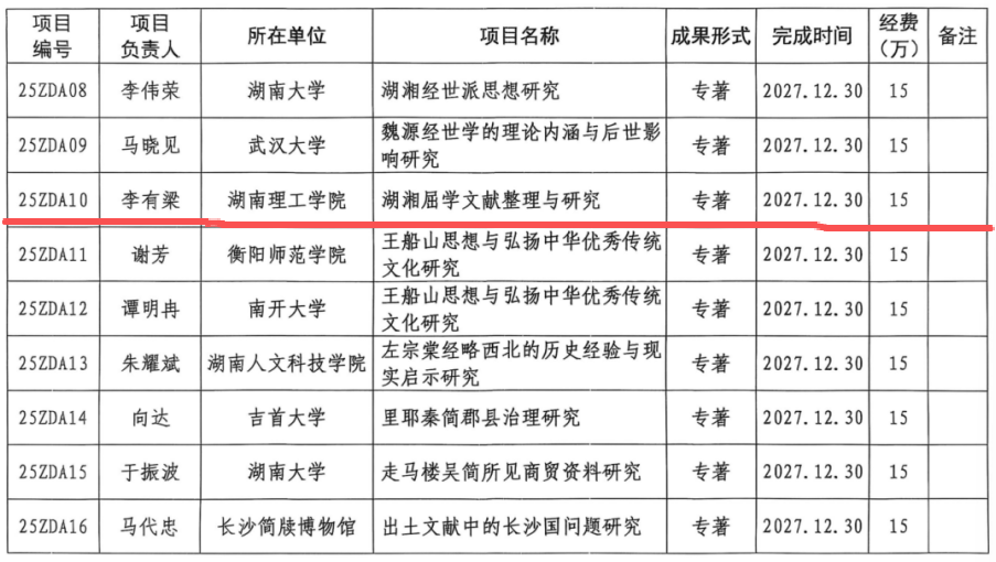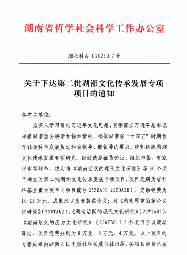 近日,湖南省哲學社會科學工作辦公室下達了第二批湖湘文化傳承發(fā)展專項項目,我院李有梁教授牽頭申報的“湖湘屈學文獻整理與研究”項目通過專家評審,獲批省社科2025年度基金重大項目,項目編號25ZDA10。