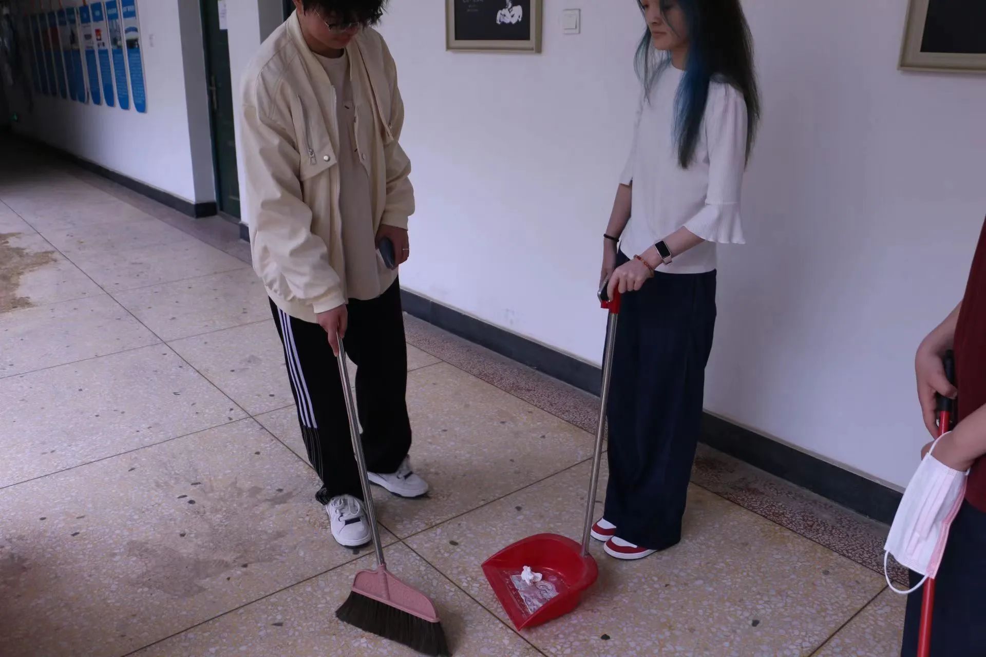 在團(tuán)學(xué)負(fù)責(zé)人的組織下,同學(xué)們有序領(lǐng)取工具、分工合作,按要求清掃了9棟4樓、5樓的樓梯間、走廊以及因暴雨產(chǎn)生積水的地面,并擦拭了走廊周圍的扶手。
