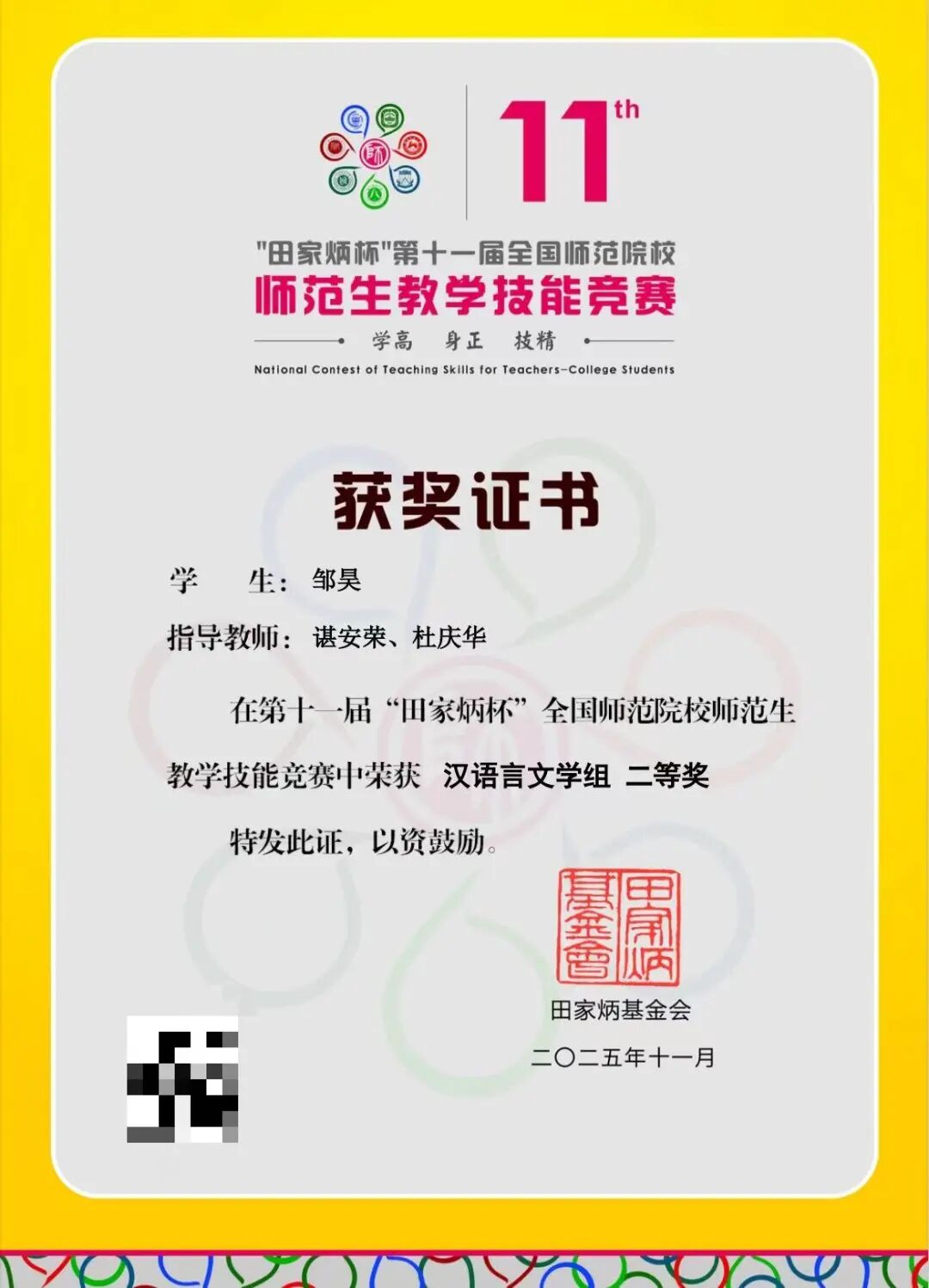 近日,第11屆“田家炳杯”全國師范院校師范生教學技能競賽決賽在浙江師范大學圓滿落幕。經過初賽和決賽兩輪激烈的競爭,文學與新聞傳播學院漢語23-2BS班鄒昊同學脫穎而出,憑借出色的專業(yè)素養(yǎng)和沉穩(wěn)的現(xiàn)場發(fā)揮,榮獲漢語言文學組二等獎。