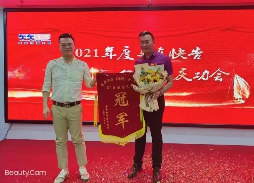 (在2021年度車車快告慶功會(huì)陳文國帶領(lǐng)分公司獲授錦旗)