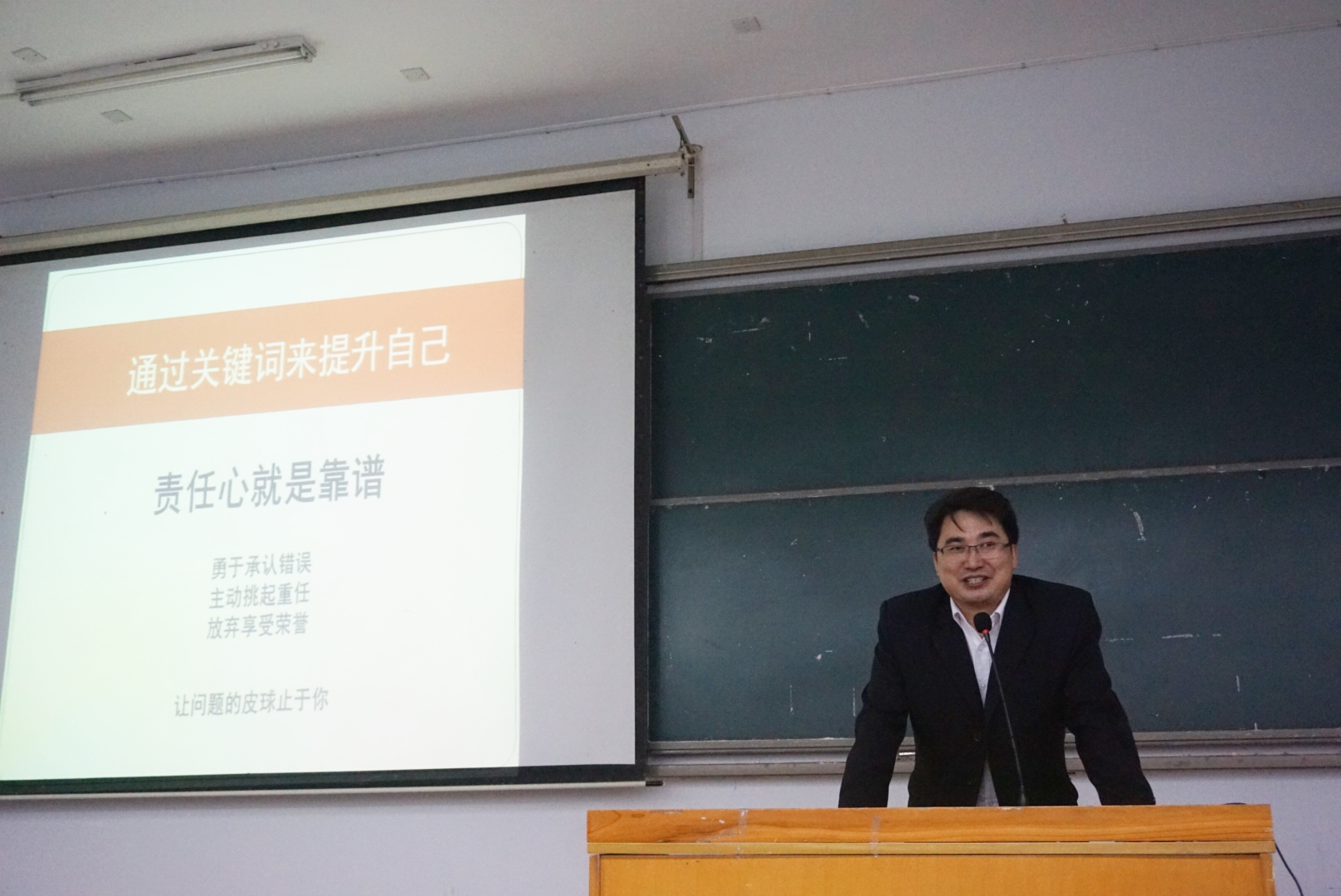 楊壽志從自身經(jīng)歷出發(fā),從五個方面展開講述。一是選擇大于努力。在正確的時間做正確的事,往往可以達到事半功倍的效果。二是忠誠度大于能力。忠誠于身邊的每一個人,每一件事,會讓人有意想不到的收獲。三是關(guān)系才是敲門磚。雖然關(guān)系有強弱之分,但無論是強關(guān)系還是弱關(guān)系,恰當(dāng)使用就對成功有益。四是責(zé)任心就是靠譜。勇于承認(rèn)錯誤和敢于挑起重?fù)?dān)的人更易被人賞識。五是自動自發(fā)。做事要主動,唯有那些自覺將“要我做”轉(zhuǎn)換成“我要做”的人,才會快人一步取得成功。他將“整、借、學(xué)、變”4個字送給在場同學(xué)。他說:要是一個人既會整合資源,借力借勢,又懂得如何保持積極的學(xué)習(xí)心態(tài)和適時改變自己陳舊的觀念,那么他離成功就不遠(yuǎn)了。