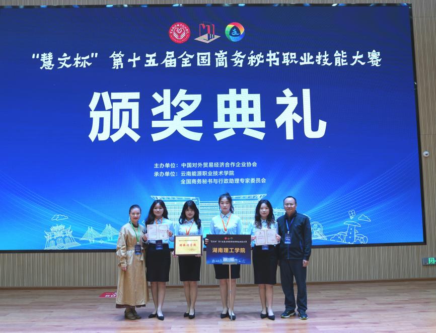 5月25日,第十五屆全國商務(wù)秘書職業(yè)技能大賽在云南省曲靖市圓滿落幕。由湖南理工學(xué)院秘書學(xué)專業(yè)學(xué)生與南湖學(xué)院文學(xué)與法學(xué)系學(xué)生組成的兩支隊(duì)伍在大賽中共摘得7項(xiàng)榮譽(yù),其中湖南理工學(xué)院代表隊(duì)榮獲本科組“團(tuán)體特等獎(jiǎng)”,湖南理工學(xué)院南湖學(xué)院代表隊(duì)榮獲本科組“團(tuán)體二等獎(jiǎng)”。同時(shí),黎卓言同學(xué)獲評“十佳秘書獎(jiǎng)”,并與梁婧同學(xué)斬獲專項(xiàng)事務(wù)處理“特等獎(jiǎng)”2項(xiàng),艾思媛、陳籽欣同學(xué)獲專項(xiàng)事務(wù)處理“一等獎(jiǎng)”2項(xiàng)。湖南理工學(xué)院在此項(xiàng)賽事中首獲團(tuán)體特等獎(jiǎng)殊榮,刷新了我校秘書學(xué)專業(yè)學(xué)生參與學(xué)科競賽所取得的最好成績。