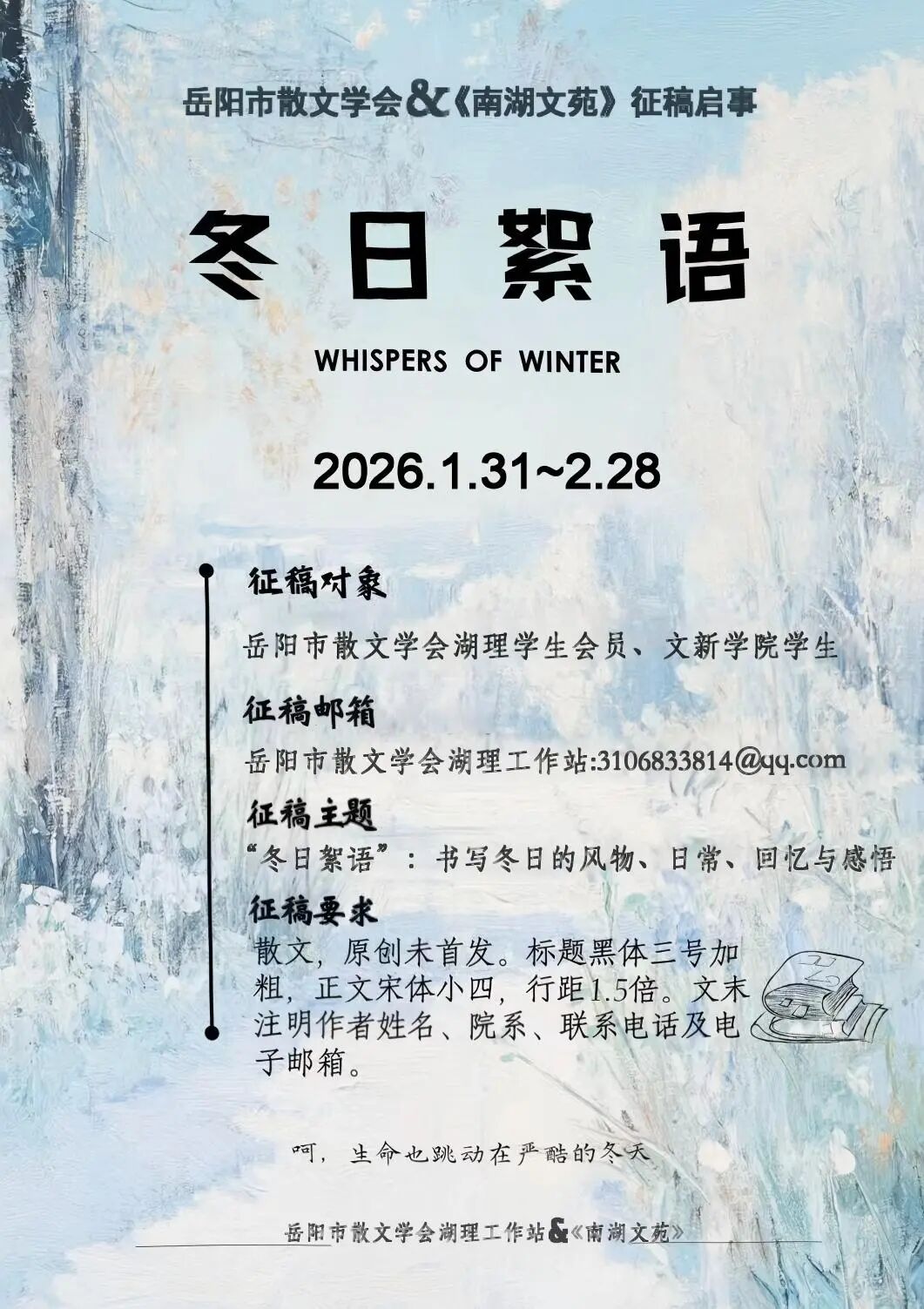 為激發(fā)創(chuàng)作靈感和熱情,豐富學(xué)生創(chuàng)作成果,岳陽市散文學(xué)會(huì)與《南湖文苑》聯(lián)合開展“冬日絮語”主題散文征稿活動(dòng)。現(xiàn)將有關(guān)事項(xiàng)通知如下: