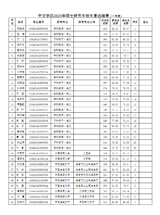 中文學(xué)院2025年碩士研究生招生復(fù)試結(jié)果(一志愿)
