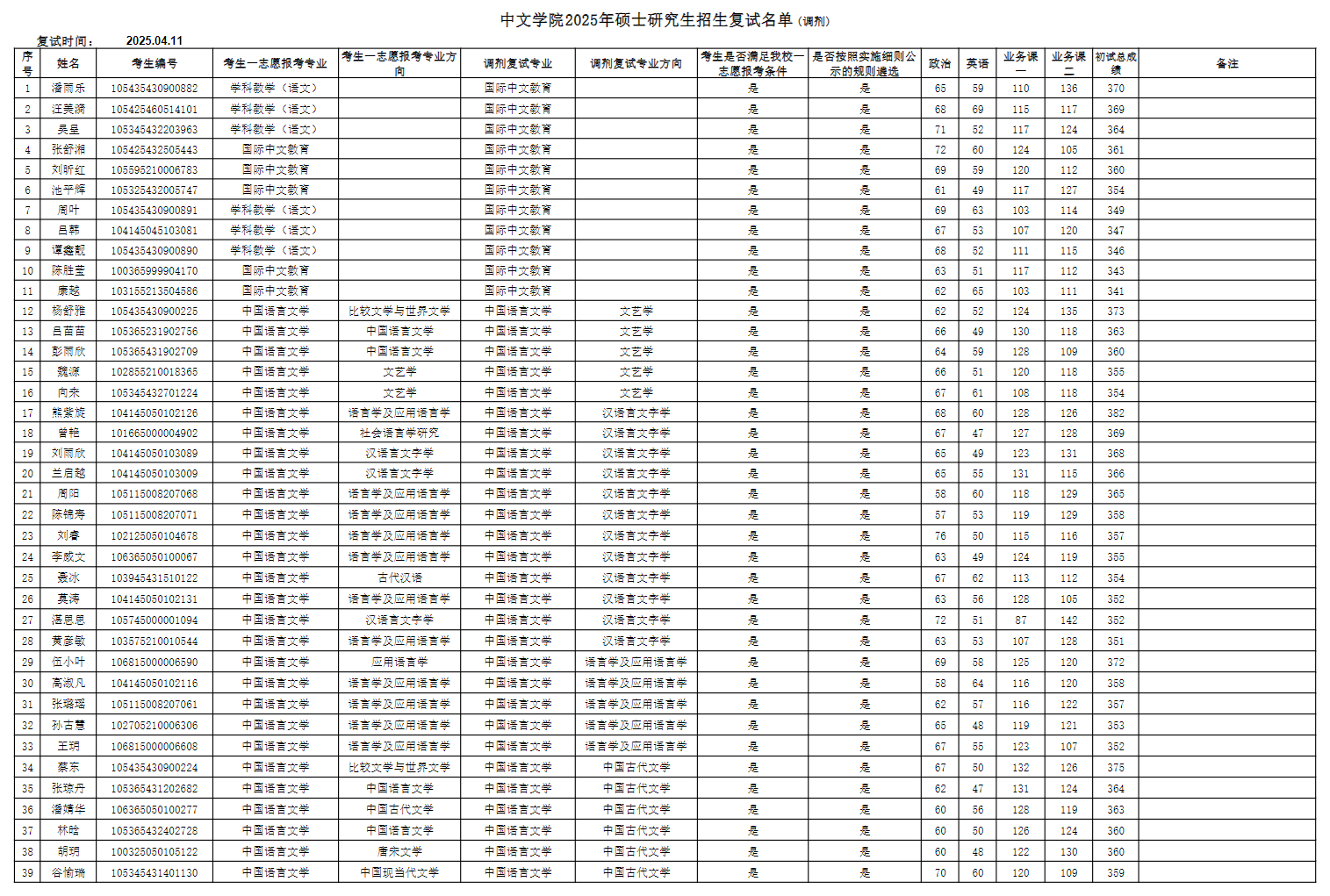 中文學(xué)院2025年碩士研究生招生調(diào)劑復(fù)試名單