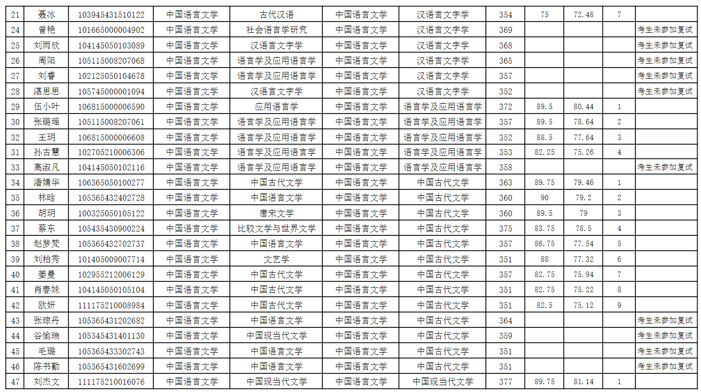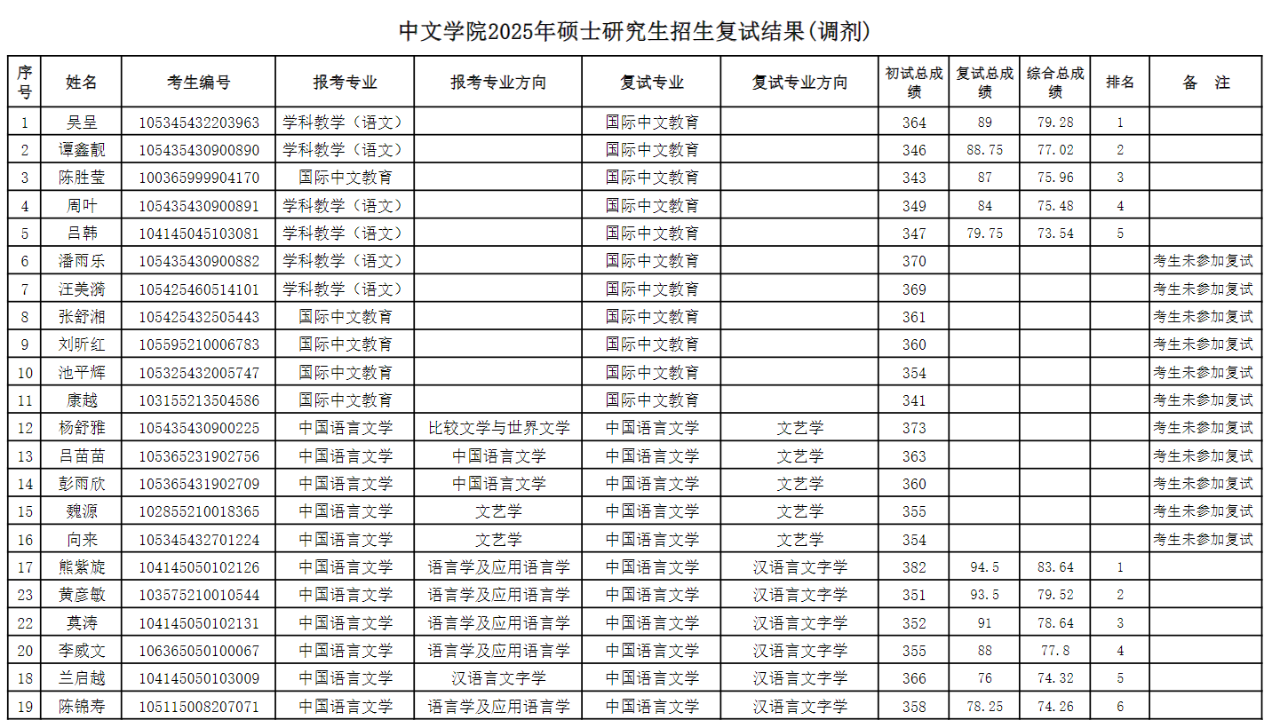 中文學(xué)院2025年碩士研究生招生復(fù)試結(jié)果(調(diào)劑)